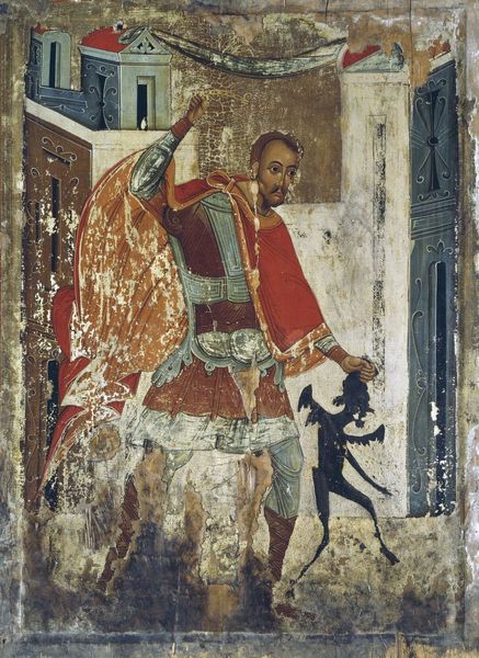 Editor: So this is Saint George, a tempera painting from around 1300. It's currently at the Byzantine and Christian Museum in Athens. I'm really struck by the material quality. It looks almost carved, not painted! What strikes you when you look at it? Curator: Well, considering the medieval Byzantine context, I immediately think about the intense labor that went into creating this icon. Think of sourcing and processing pigments, potentially from ground minerals like lapis lazuli, the meticulous layering of tempera, probably egg yolk based. Then there's the wooden panel itself— who forested, seasoned, and prepared it? How does that influence the viewing of religious imagery? Editor: I hadn’t considered all that manual effort! So, instead of seeing just a saint, we should be thinking about the various artisans and materials involved? Curator: Precisely. Even the gold leaf used for the halo points towards a network of trade and specialized craft. This isn’t just about religious symbolism, it’s about economics and social stratification expressed through materiality. Note the details and craftsmanship of his clothes, especially his boots; is there attention to this, maybe even to depict George as particularly divine? What sort of message does it bring in terms of the labor force involved? Editor: So, you're suggesting that the icon's value, both spiritually and monetarily, is embedded in the material processes that made it possible? Curator: Exactly! It's easy to get lost in iconography, but by grounding ourselves in the "how" of its making, we can better understand its place in society and how people truly engaged with it. Editor: That's a totally different way of thinking about religious art, thanks! It makes me consider where this painting was made and what the context was, rather than just thinking about the subject portrayed. Curator: Yes, thinking about where materials came from, who supplied them, how techniques impacted workshops or other art objects opens up avenues into broader connections to our present society.