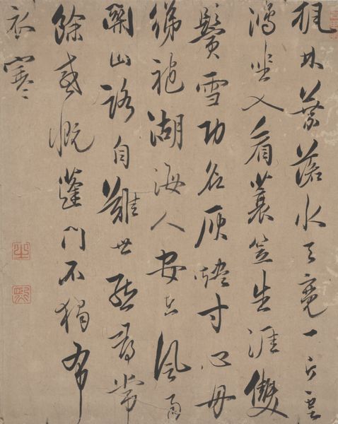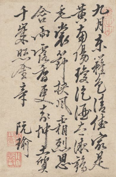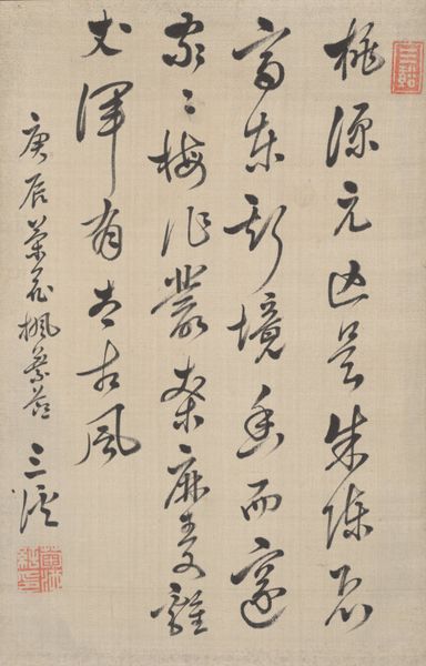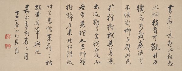 Curator: The calligraphic print before us, titled "Poetic Quatrain," was crafted around 1795 by Makita Chōsai. It's executed in ink on paper. The poem is rendered in a form of Japanese calligraphy that feels particularly compelling to me. Editor: My first impression is its striking balance of delicate, flowing strokes and the assertive, almost industrial presence of those vermillion seals. There's a tangible contrast in texture; it begs to be explored physically. Curator: Absolutely. The layering is what first stands out. Calligraphy in East Asian traditions transcends mere writing. Each stroke embodies the artist's spirit and philosophical grounding. Editor: Thinking of the materiality, the paper itself holds stories. Sourcing the materials, the preparation of the ink—these elements inform how the brush interacts with the surface. Labor and craft intertwine. Curator: We can consider the historical context. What did it mean to create this work in the late 18th century? Japan was undergoing substantial political and social transformations, a period which is likely deeply influential. Also, who would have been able to create this kind of art, considering it involved mastery and, quite frankly, wealth. Editor: Yes, access! Who consumes the work matters as much as who creates it. It invites questions about display, trade routes, and cultural exchange—even then! Also the labor required to get all these resources would impact how this would be displayed. Curator: And to what extent the content—the poetic quatrain itself—reflected the era’s intellectual and emotional landscape. Is it a protest or social critique of the time? How can the materials amplify those intended messages. Editor: Thinking of the work, how were paper, ink, and brush combined in such a personal manner to express social views. Curator: The “Quatrain” stands not only as an artwork but also a historical document. Editor: An artifact, definitely one whose meaning extends far beyond simply what we read. Thanks for adding that lens, its always great learning with you. Curator: Likewise!