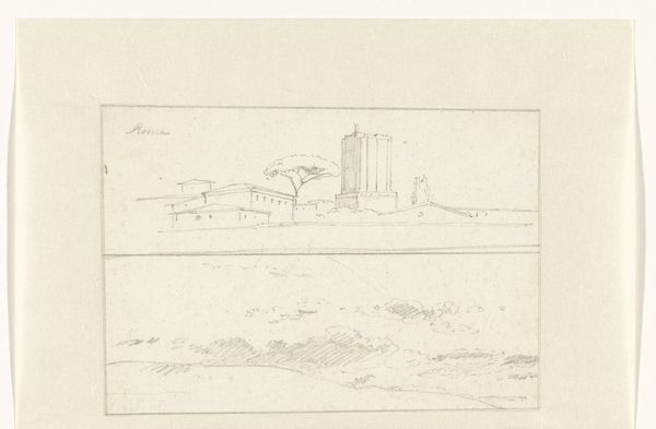 Curator: This pencil drawing, made by Johannes Tavenraat in 1844, offers a glimpse of Slot Langenau near Nassau. It's currently held in the Rijksmuseum. Editor: There's a beautiful fragility to the work, isn't there? The lines are so delicate; almost like a memory fading at the edges. Curator: It speaks volumes about the Romantic era's fascination with ruins and the past. One sees these structures as emblems of time's relentless march, viewed against the backdrop of a rising nationalism and the rediscovery of folk traditions. Editor: Indeed. The contrast in line weight contributes a sense of depth and atmospheric perspective. Note, too, the subtle use of light and shadow to model the forms of the castle walls, conveying their mass without unnecessary detail. Curator: What's most striking for me is the drawing’s presumed purpose. This wasn't conceived as a grand statement; instead, it looks to me more like a personal sketch. We could examine its connection with early forms of tourism or exploration and understand how that might impact artistic intention, for instance. Editor: I appreciate the way the composition guides your eye upwards, drawing attention to the castle ramparts and the interplay between geometry and nature. There is an unspoken connection with sublime landscape. Curator: And those loose, almost scribbled lines hinting at foliage—they certainly prevent the depiction of this historic site from being too clinical. Tavenraat uses nature, in the sketch, as the ultimate frame through which we are invited to consider cultural narratives embedded in landscape itself. Editor: The simplicity almost verges on abstraction. Its skeletal suggestion encourages you to build the fortress and its landscape around it, filling the gaps using our own visual literacy. Curator: Yes, but it is through studying artistic interpretations and these sketches as cultural documents that can help us decode public meanings or project onto these silent monoliths through the lens of social history and lived experiences. Editor: It really gives a certain life, as if its subject just left only moments ago. Curator: A testament to how much our relationship with the past depends on what artists like Tavenraat choose to show us—or, as importantly, what they leave out. Editor: Ultimately, I would like to believe that is precisely that incompleteness is its biggest strength.