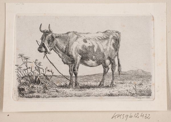 This is Eugène Verboeckhoven’s "Koe in een wei", a drawing rendered in graphite. The initial impression is one of subdued harmony, largely due to the limited tonal range and soft gradations achieved through the graphite medium. The composition centers on the cow, positioned almost squarely in the frame, allowing the viewer an unmediated engagement with the subject. Verboeckhoven's meticulous detailing, especially in the animal's musculature and the subtle variations in its coat, brings a certain formal dynamism to the work. Yet, there’s also an understated quality; the drawing does not strive for dramatic effect. What is compelling is the underlying structure—the artist's deliberate choice to represent the cow in a seemingly straightforward manner, devoid of overt romanticism. This can be interpreted as a reflection of the changing artistic landscape of the time, a move towards realism. The drawing invites us to reflect on the cow's inherent form, prompting a deeper consideration of its being.