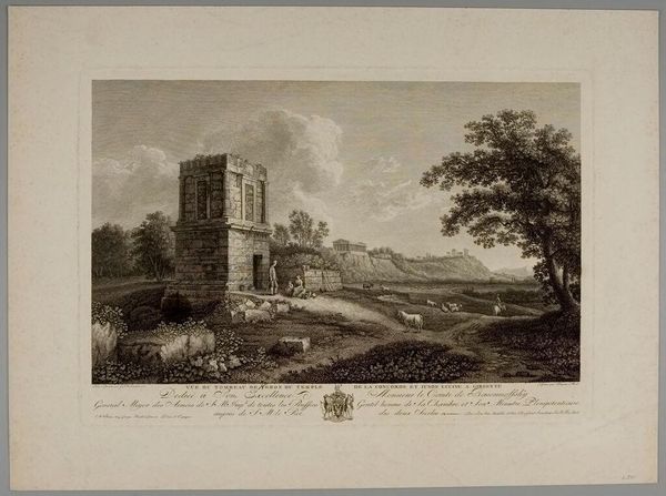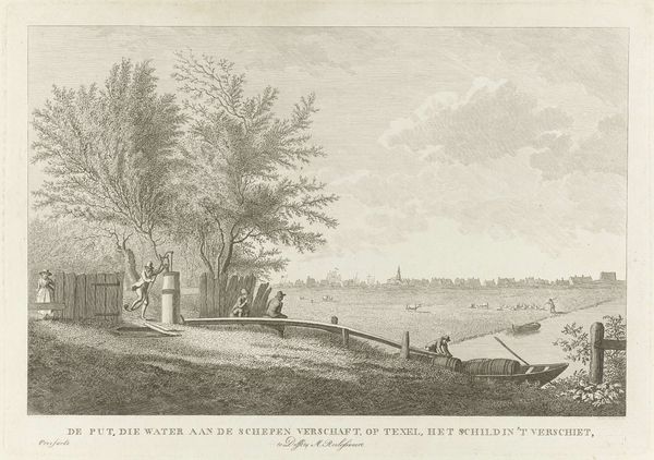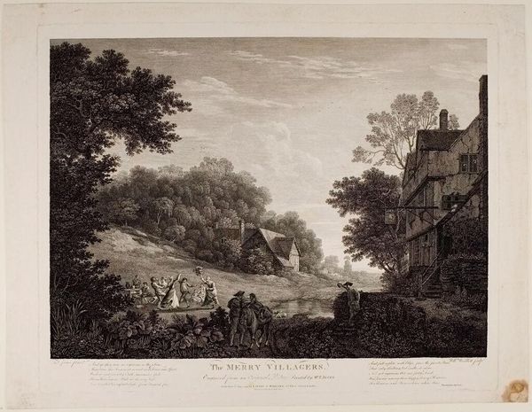 Curator: This is "Second View of the Outskirts of Tivoli," by P. Gabrieli, depicting a tranquil riverside scene. Editor: Oh, it’s like a dream! A hazy, sun-drenched afternoon, all leisurely pursuits and chattering groups. Curator: The print emphasizes the means of conveyance of the era, both by water and land. Note the variety of social classes depicted interacting. Editor: It’s the architecture, though, that grabs me. That crumbling stone structure, nature reclaiming it. It speaks of time, loss, and enduring beauty all at once. Curator: It's a picturesque scene designed for consumption, reflecting the era's fascination with landscape and travel. Editor: Absolutely, but it’s more than just a pretty picture. There’s a palpable sense of atmosphere. A gentle melancholy, maybe? Curator: Indeed, the commodification of landscape and the role of art in shaping perceptions of place are also important here. Editor: It's lovely to see how an image designed for circulation becomes a vessel for personal reflection.