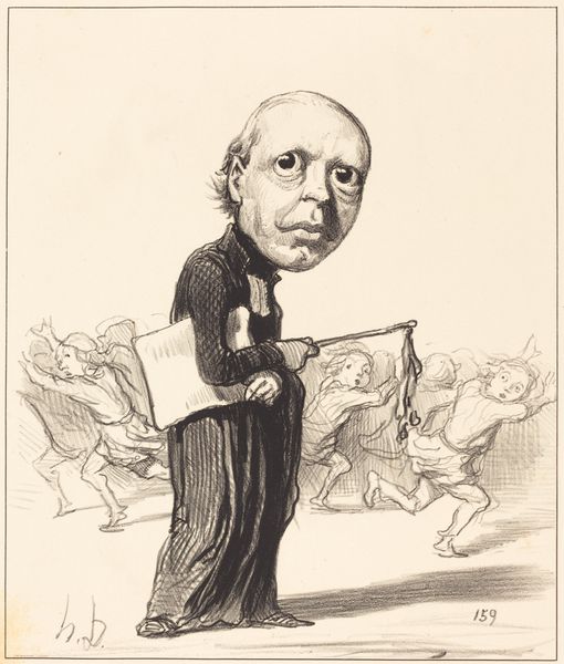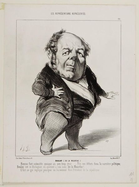 Curator: This is Honoré Daumier's lithograph of J. B. Gustave de Laboulie, part of his series "Les Représentants Représentés." It's currently housed at the Harvard Art Museums. Editor: It’s striking how Daumier uses line and shade to create such a strong sense of volume, especially considering the exaggeration. You can almost feel the weight of his presence. Curator: Daumier used caricature as a powerful tool of social critique, often targeting the bourgeoisie and political figures of his time. He was deeply invested in the role of art within political discourse. Editor: The lithographic process itself is fascinating—the way the image is built up through layers of grease and ink. It's a relatively accessible medium, which fits with Daumier’s interest in reaching a wider audience. It democratizes image-making. Curator: Indeed, Daumier's work was often published in newspapers, bringing political commentary to the masses. Laboulie here seems to be presented as somewhat severe or self-important. Editor: Definitely! You see it in the pursed lips, the folded arms—all rendered with such economy of line. It shows how deeply Daumier understood the materials he was working with and what effect it would have on the final product. Curator: It's a potent reminder of how art can shape public perception. Editor: And of how readily accessible art can hold so much power in our social landscape.