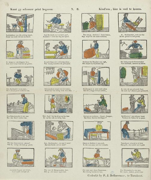 Curator: Today, we're looking at Franciscus Antonius Beersmans’ “Kinderspelen,” a woodcut print dating from 1866 to 1902. Editor: What immediately strikes me is how the artist captures the seemingly boundless energy of children at play within such confined, miniature panels. Curator: Indeed, the compartmentalization into sequential narratives offers an intriguing exploration of visual syntax. Beersmans employs a simplified, almost diagrammatic approach, using line and blocks of color to construct a lexicon of childhood actions. Consider the composition: each panel operates as a distinct semiotic unit. Editor: While I agree on the segmentation, to divorce it from its societal implications seems incomplete. "Kinderspelen" translated to "Children's Games" appears almost ethnographic in its display of innocence. But what rules of conduct, visible through play, are being both upheld and subverted here? Curator: One cannot ignore how the use of line creates both the figures and implied movement through space. It’s economical in its effect. The artist has achieved considerable articulation with very spare elements, consider the gestures, their placement. Editor: I think this invites deeper reflection on the position of childhood at the turn of the century—the romanticization, yes, but also the expectations of proper behavior in terms of budding maturity and their participation within the capitalist machine. Curator: Returning to form, observe the artist's conscious manipulation of depth. The spatial flatness emphasizes a kind of universality that asks you to consider its underlying, immutable forms. Editor: However, what feels frozen might, to modern sensibilities, speak of constriction, social expectation. Are these candid snapshots, or models to be imitated and adhered to? Curator: I appreciate your viewpoint and your effort to extend our experience of the visual into other domains of experience. Editor: Thank you, by considering its form and content as integrated, the seemingly straightforward and antique yields nuanced readings on society and representation.