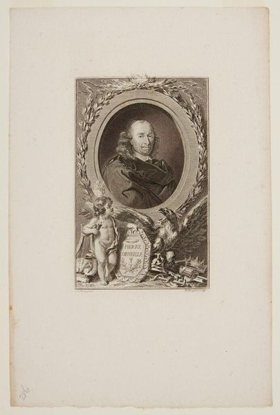 Curator: I’m struck by the melancholy of Jean-Baptiste de Grateloup’s portrait, "Adrienne Lecouvreur." There’s such a weight of emotion captured in those delicate lines. Editor: Indeed, the image itself feels like a memento mori. The oval frame and the urn she's holding are laden with symbolic meaning, reminiscent of mourning jewelry. Curator: Absolutely, and the choice of Adrienne Lecouvreur, a celebrated actress who was denied Christian burial, makes it a potent comment on social injustice and the performative aspects of grief. Editor: The urn is particularly interesting. It's not just a vessel but a symbol of remembrance, and the way she clutches it suggests both love and loss, a kind of theatrical sorrow, fitting for an actress. Curator: Seeing this work, one cannot help but consider the evolving role of the actress in the 18th century and how Grateloup's print immortalized her talent and societal struggles. Editor: It’s a powerful reminder of the enduring symbols we use to express complex human emotions like grief and injustice through art.