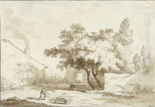 Curator: This is Jacob van Strij’s "Riverbank with windmill", housed here at the Städel Museum. It’s rendered with ink, chalk, and watercolor on paper, reflecting a moment of daily life in a Dutch landscape. Editor: It evokes such a stark, almost desolate feeling. The muted colors and spindly, bare trees create a wintery atmosphere. Despite the figures present, there's a sense of loneliness about the scene. Curator: Interesting. Considering the time, it probably demonstrates the close relationship that people maintained with their immediate environments; think about reliance on watermills for grinding grains. And of course the importance of waterways for transport of material goods, demonstrated here with people seemingly crossing to or from the city. Editor: That's true. The windmill itself looms large, a clear symbol of industry and sustenance. But consider the human figures. One strains pulling the cart, the figures in the boat labor at the oars, their work perhaps amplified by their diminutive forms—do they feel insignificant under its shadow, overshadowed by the machine and nature's indifference? Curator: We know van Strij worked outside—en plein air— and one thing that immediately stands out is his confident mark-making with a variety of materials. See how he's built up tones, created texture, almost scumbled the ink to give form and volume to that stand of trees, contrasting against more spare underpainting across the water? He clearly values the application process. Editor: Yes, and his specific choices lend themselves to symbolic interpretation. The water, for example, the very lifeblood of their commerce, becomes almost menacing here; and perhaps the people pulling their cart will fail in their journey. Those bare trees and muted earth tones might signal not just the season, but a kind of societal barrenness or hardship. Or, perhaps it evokes acceptance of an unchanging landscape and environment as well. Curator: Right. Van Strij used everyday, local scenes to demonstrate societal changes and to record how ordinary people survived at a moment when machine began replacing manual means. He probably ground his own chalk! That direct relationship with raw material underscores an emerging culture. Editor: Precisely. So the images offer far more than just pastoral charm or winter melancholy. Curator: Thank you. By delving into its production, materials, and figures, we understand this piece documents people living on the edge, facing an impending social transition. Editor: Agreed. By looking at his art more closely, one appreciates how symbolic imagery and attention to material converge to tell nuanced stories about nature and our complicated place in its order.