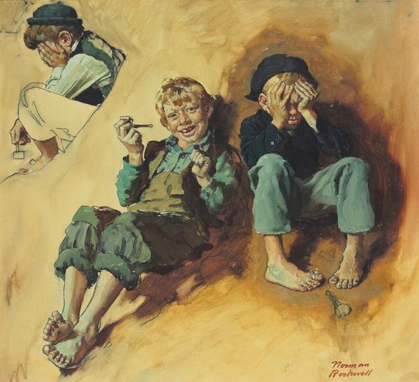 Editor: This painting, attributed to George Harvey and titled "The Wee Deil," captures a seemingly candid moment of three children engrossed in some game. The earthy palette lends it a raw, almost documentarian feel, but it's the light and shadow interplay that really draws me in. What strikes you when you look at it? Curator: It is quite interesting to consider "The Wee Deil" purely from a formal perspective. Forget, for a moment, these are children and focus on the composition. Notice how Harvey uses a restricted colour palette, mostly earth tones, punctuated by the vermillion shirt, creating visual focal points. Observe how the impasto of the brushstrokes, particularly in the lighter areas, creates a certain haptic texture. Editor: Haptic texture? Like you want to touch it? Curator: Precisely. This, of course, plays against the smooth finish in other areas. Furthermore, the triangular arrangement of the figures is a classic compositional device, but it's subtly disrupted by the varied heights and postures, adding a sense of informal spontaneity. Tell me, what do you observe regarding the relationship between form and content in this painting? Editor: Well, I see what you mean. Even without knowing anything about who these children are, you can appreciate the tension he’s created, the textures. So is it almost like he's telling a story with just color, light and form? Curator: Precisely. And remember that for a formalist art historian such as myself, "story," "emotions," and "artists" themselves are constructs we seek to deconstruct, leaving only pure, unadulterated form. In this regard, how do you feel the formal aspects, contribute to or distract from a possible understanding of "The Wee Deil"? Editor: That’s a completely different way of experiencing the work, really fascinating. It almost flattens it in a way, stripping back assumptions… while also building something new based purely on visual cues. Thank you! Curator: Indeed, the form *is* the content in Formalism. A worthwhile exploration!