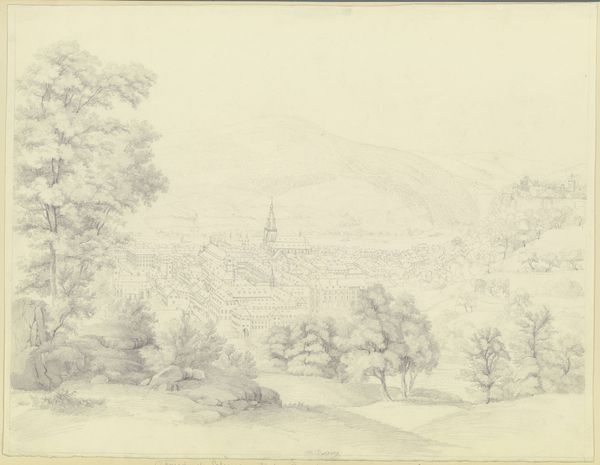 Curator: Here we have Johann Martin von Rohden's "View on Palermo," a pencil drawing completed on July 28, 1833. It's a fantastic example of Romantic landscape drawing. Editor: Ah, Palermo in soft pencil light! It’s so ethereal; like a dreamscape hanging in the balance, ready to dissipate at any moment. The texture is fascinating too. Curator: The use of pencil in this manner is intriguing, indeed. Rohden exploits the medium to create gradations in light and shadow, which was crucial in communicating Romanticism's key element - fleeting moments of visual harmony with the natural world. And as a portable medium, we must acknowledge how readily available pencils were to the 19th century tourist market of the area. Editor: I'm more captivated by the way the architecture emerges from the natural world like a mirage, nestled in a valley that’s somehow both embracing and distanced. See how those distant mountains melt into the sky? I wonder what personal resonance this place held for Rohden? Curator: The materiality informs this relationship, don’t you think? Pencil's portability lends itself well to creating studies on location for larger paintings back in the studio. Perhaps these delicate lines are sketches produced during an early-career journey across Italy as part of Rohden's formative education. It is, in a way, a document of labor. Editor: It certainly feels like a momentary, private vision that we are gifted to witness. Perhaps it's precisely this feeling that encapsulates what's sublime about Romanticism, isn't it? The feeling that the human soul is momentarily aligned with some greater force. It is something that no factory is able to produce on a repeatable assembly-line scale. Curator: Precisely. By looking at the materials, techniques and context we can understand how the artist and wider production practices created a perfect storm to channel ideas around man and nature. It highlights the tension between industry, artistic pursuit, and how the location itself facilitates this discourse. Editor: To look at Palermo with Rohden's eyes is to feel a strange stillness, suspended between the earthly and the ineffable. I like that paradox very much. Curator: Indeed, thinking about the ready availability of pencils also allows us to examine and critique the mass commodification of idyllic scenery.