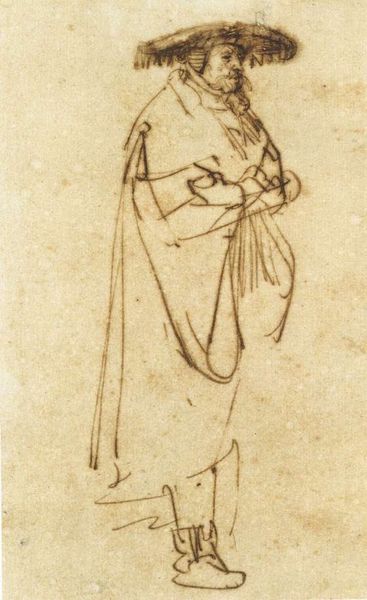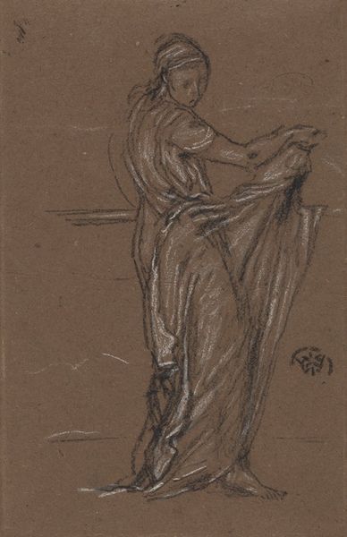 Editor: Here we have Whistler's "The Dancing Girl," created around 1870, using coloured pencils. I'm struck by its ephemeral quality. The lines are so delicate, almost hesitant, yet they convey a sense of movement and vulnerability. What do you see in this piece? Curator: It's a fascinating work to consider through a feminist lens. In the context of 19th-century Orientalism, how does Whistler represent the female figure? Is this an exploration of female identity or does it reinforce prevailing cultural tropes? Does the title itself, "The Dancing Girl," reduce the subject to a mere object of spectacle? Editor: I hadn't thought about it in terms of Orientalism. The sketch-like quality made me focus more on the technique than the subject. So you're saying the title and pose might perpetuate stereotypes? Curator: It prompts the question, doesn't it? Consider the dancer's averted gaze, her clothed body, compared to the era’s other depictions. Where is the agency? What narratives might be missing? What power dynamic does the artist establish between viewer and subject through composition? What might her dance represent to herself, not as a performance, but as an act of cultural resistance? Editor: So, it’s not just a pretty picture, but a statement – or perhaps an unwitting reflection – of cultural power structures. I see it so differently now. Curator: Precisely! By questioning the accepted narratives and considering the socio-political climate, we uncover a richer, more nuanced understanding. We bring her into the discourse. Editor: Thanks, I'm going to be considering Orientalism’s impact on art for a while. Curator: Indeed, an important step for art appreciation.