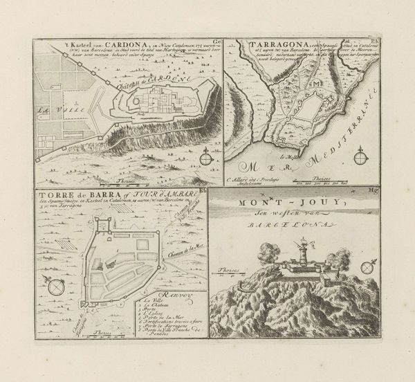 Curator: Here we have Abraham Allard’s "Plattegrond van Mainz," a city map dating from the period of 1702 to 1733, currently residing at the Rijksmuseum. The artwork combines drawing and print techniques on paper. Editor: It’s so interesting! My first thought is how incredibly detailed it is for a relatively small format. You can almost trace the layout with your finger, sensing the textures of paper, ink, and engraving, thinking about the meticulous labor. Curator: Indeed! What draws my eye are the almost star-like geometric figures layered into the lower portion, and I notice "Goffesrvesburg" near one of them, suggesting military fortifications are charged with sacred symbolism, perhaps protecting the sacred city. Editor: Absolutely. Look at how those elaborate fortifications integrate directly into the city plan. It emphasizes Mainz’s strategic importance, no doubt related to military and trade logistics dependent on its geographic positioning between rivers. Think of the planning, the sheer manpower involved! Curator: Note too how the rivers – the "Rhenus," the Rhine, and the Main – dominate the visual space. Water as both life source and dividing force is key to understanding the psychological experience of those living here. This landscape *is* their experience, encoded for us in ink. Editor: That river dominance shapes material reality, both then and now. Consider the resources derived from it: the fish, the trade routes, and the potential for defense. Engraving was used for printing since it allowed for longer printing, thus this was a good medium of disseminating important geopolitical information to decision-makers. Curator: Do you see how Mainz rises like an island, set apart both literally and symbolically by those waterways? Allard doesn’s simply present a plan, but suggests something deeper, a collective imagining. Editor: I do now. Thank you! I now see it is both an artistic rendition, a technical drawing, and, fundamentally, about the materials that constituted life for the early modern inhabitants, shaped by conflict and commerce.