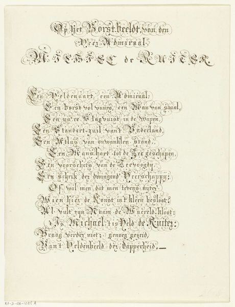 These verses, elegantly calligraphed, commemorate Michiel de Ruyter, a Dutch admiral. The text, adorned with stylized flourishes, echoes the laurel wreath, a classical symbol of victory and honor. Consider how the laurel, once gracing the brows of triumphant emperors and poets in ancient Rome, finds its way onto a page dedicated to a naval hero. This motif, deeply embedded in our collective consciousness, transcends time and place. It evokes a sense of glory, valor, and enduring fame, harking back to the grand narratives of classical antiquity. The laurel wreath, like many symbols, undergoes a metamorphosis through history, adapting to new cultural landscapes while retaining its core essence. It speaks to our innate desire for recognition and our deeply ingrained admiration for those who display courage and achieve greatness. The emotional resonance of such symbols engages us on a subconscious level, connecting us to the past in profound and meaningful ways.