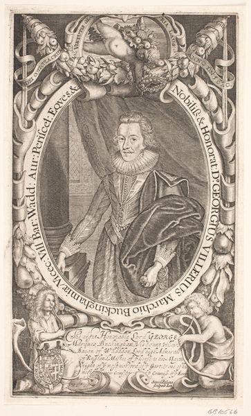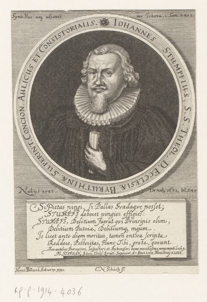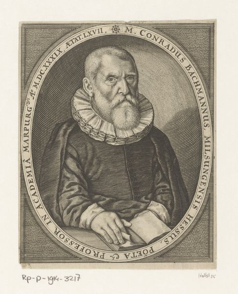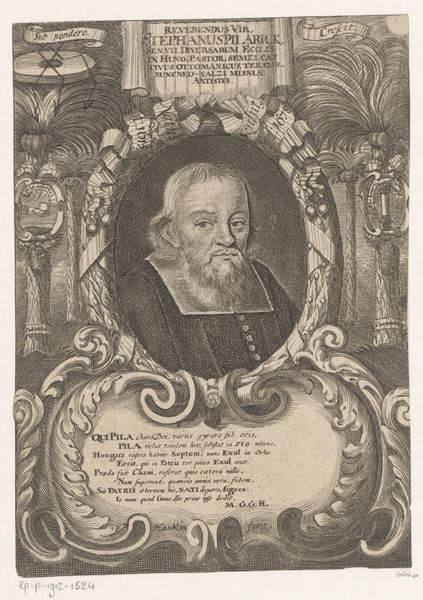 Lucas Kilian created this engraving, "Portret van Ludwig Bischoff op 55-jarige leeftijd," sometime in the early 17th century. This portrait captures Bischoff, a prominent bishop, within the rigid social and religious structures of his time. Consider the power dynamics at play here. Bischoff's identity as a man of the church is emphasized through symbolic elements like his book, dress and the Bishop’s coat-of-arms, which speak to his religious authority. The Latin inscriptions surrounding the portrait reinforce his learned status and connection to religious doctrine. However, it’s also worth pondering the limitations placed upon individuals, particularly within the church, where adherence to religious dogma often came at the expense of personal expression. Kilian’s work provides a glimpse into a world where identity was deeply intertwined with religious and social expectations, inviting us to reflect on the complexities of self-representation and the negotiation of identity within prescribed roles.