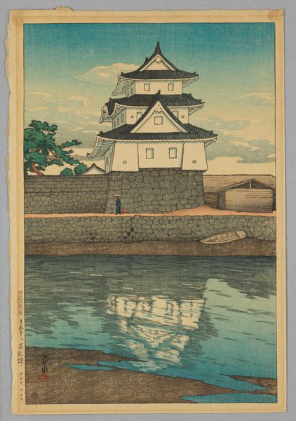 Editor: Here we have Kawase Hasui's 1937 woodblock print, "Zenstu Temple in Sanshu". It’s incredibly serene, almost melancholic with the rain. The temple is impressive, but I'm also struck by how ordinary life continues around it with those figures walking with their umbrellas. How do you interpret this work, looking at it through a wider lens? Curator: It’s crucial to consider this work within the context of Japanese modernism and the rise of national identity. Hasui and the *shin-hanga* movement consciously revived traditional ukiyo-e techniques, but aimed to create prints reflecting a modern Japan. Editor: So, it’s not just about beautiful scenery? Curator: Precisely. This idealized depiction of a serene temple exists alongside increasing militarization and imperial expansion in the 1930s. Consider the figures: are they simply going about their day, or are they symbols of resilience, maintaining normalcy amidst societal pressures? Are they also a statement of social class? Who would own an umbrella? Editor: That's a powerful point. It forces us to ask what's absent, too. Curator: What’s not being shown? Where are the disaffected, the impoverished? This print functions as both art and cultural artifact, presenting a carefully curated image of Japanese life at a critical moment. How do you see its appeal today? Editor: It is beautiful and peaceful. I’m just struck by the weight of that history underneath the surface. It’s made me think about the responsibility of art and how it reflects, and sometimes obscures, reality. Curator: Absolutely. And how our perception of the work also changes, given that now, almost 100 years later, it embodies many different values and anxieties for current societies.