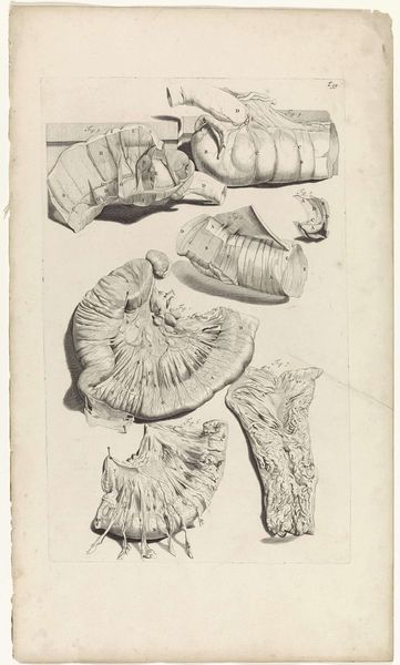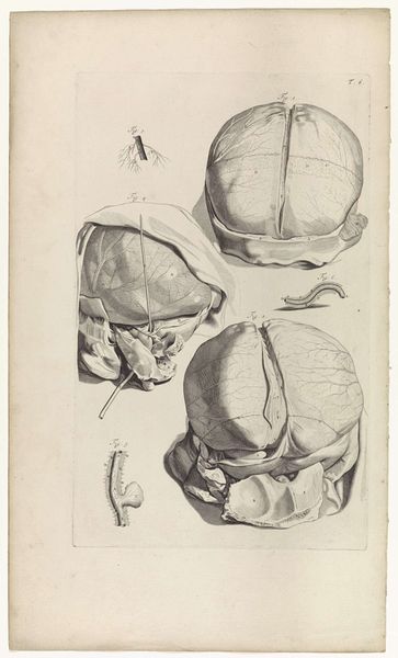 Pieter van Gunst created this anatomical study of a skull in the Netherlands in the late 17th or early 18th century. This detailed engraving offers a glimpse into the period's burgeoning interest in scientific inquiry. During this time, the Dutch Republic was at the forefront of intellectual innovation. Universities such as Leiden played a crucial role in advancing anatomical knowledge. The display of human remains also became increasingly common, offering insights into the inner workings of the body. Engravings like this were vital in disseminating knowledge, particularly within medical communities and the emerging scientific societies of the day. By studying the networks that supported artists like Van Gunst, or the patronage of scientific institutions, we can better understand the historical context surrounding this image. Ultimately, it serves as a reminder that art, even in the service of science, is deeply intertwined with the social conditions of its time.