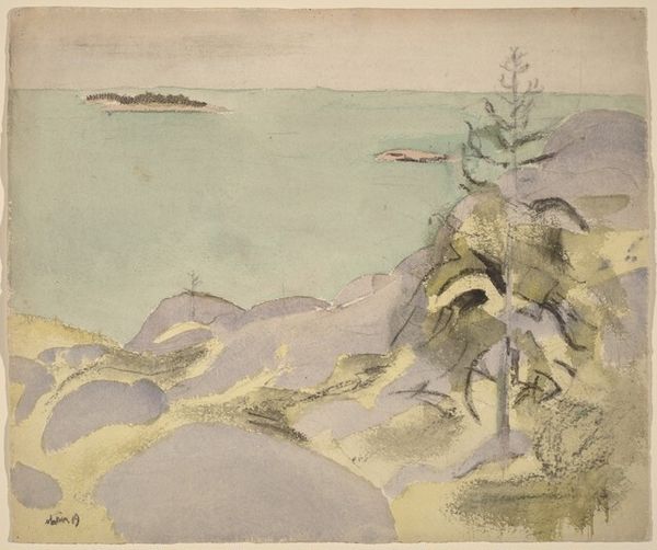 Editor: So, here we have David Young Cameron’s “Castle Urquhart,” which seems to be a watercolor and ink drawing. It’s quite striking; I’m drawn to the subtle, almost faded, colors, which give the castle an incredibly distant, almost ethereal, feel. What's your take on how this piece speaks to its time, considering the historical context? Curator: It’s interesting you pick up on that feeling of distance. Consider Urquhart Castle's history – a site of strategic importance, repeatedly fought over through centuries. By Cameron’s time, its strategic value had long vanished, and it existed primarily as a ruin, a picturesque object. So, what we see in Cameron’s interpretation is a shift: the castle as a monument of a faded, arguably romanticized, past. The light watercolor and slightly muted palette, as you pointed out, contribute to this sense of bygone eras, almost fading from living memory. What about the composition itself – anything strike you about how the artist presents the subject? Editor: I think how Cameron places the castle right at the edge of the water emphasizes its isolation, and almost implies its vulnerability. It feels very exposed. Curator: Exactly! This also has roots in art’s public role. Picturesque ruins, like Urquhart, became popular subjects during a time of rising national identity. Representing Scotland's landscape with these melancholic relics helped forge a shared history, a national narrative tinged with both pride and loss. Editor: That makes so much sense. I had considered its artistic choices in composition but I failed to link it to the historical context and the rise of Scottish national identity. Curator: Seeing art as a product of both aesthetic choices *and* its socio-political moment gives us a much deeper appreciation for its lasting impact. It makes you wonder, what story are contemporary artists telling through the imagery they choose? Editor: Absolutely. I will remember to link composition and identity next time. Thank you.