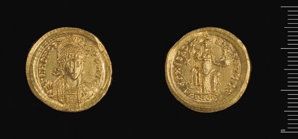 Editor: This is a gold coin of Kanishka I, from the Harvard Art Museums. The images seem to depict figures with symbolic objects. What can you tell me about these images? Curator: The coin acts as a vessel, carrying cultural memory. Consider how the image of Kanishka presents him as a ruler, adopting both local and foreign religious iconography. What elements on the coin strike you as particularly symbolic? Editor: I notice what looks like solar and lunar symbols. Curator: Precisely. The Kushan Empire synthesized multiple cultural influences, and these symbols reflect cosmological beliefs and the ruler's divine right. What does the continuity of these symbols over centuries suggest about their power? Editor: That symbols can transcend cultural changes, retaining a consistent meaning. Curator: Exactly. And this coin becomes a microcosm of how cultures negotiate and represent power through enduring symbols.