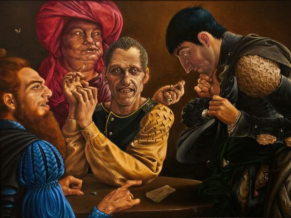 Daniel Greene painted this oil on canvas titled, "At the Auction". Greene’s painting invites us to consider how spaces of commerce can also be stages for social performance. The individuals here are composed in such a way as to represent a stratified society. Note the sartorial choices, the body language, and the gazes that do—or do not—meet. Who has the power? Who is performing for whom? Greene, who was committed to representational painting, once noted that he sought to capture the “dignity of ordinary people.” Yet, there is a tension here: are we, the viewers, also implicated in this social hierarchy? Is the act of observing and interpreting this scene a reflection of our own biases and assumptions? How do we negotiate the complex dynamics of observation, representation, and judgment that Greene presents? Ultimately, this work remains a poignant reflection on the ways we construct and perceive social and economic power, inviting us to reflect on our own roles within these systems.