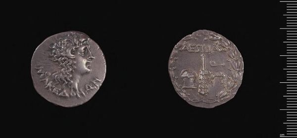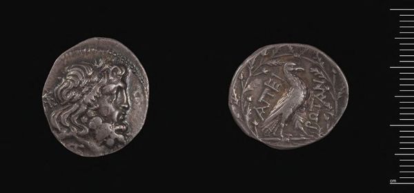Curator: Here we have a silver Tetradrachm likely from Corinth, featuring Alexander the Great. Editor: It’s incredible how such a small object can convey so much power. The figure of Zeus, especially, feels commanding even on this scale. Curator: Indeed. Consider the socio-economic implications: this coin represents both wealth and the far-reaching influence of Alexander's empire. Silver as currency shaped trade and power dynamics. Editor: And that depiction of Alexander wearing the ram's horn, a symbol of divinity, speaks volumes about his self-fashioning as a god-king. Curator: The material itself, silver, carries weight. It’s a tangible representation of value created through mining, refining, and distribution networks. Editor: The eagle at Zeus's side further reinforces the idea of divine authority and imperial reach. It's a clear visual language. Curator: Seeing the means of economic production as the roots of meaning certainly shifts my perspective on antiquity. Editor: Absolutely, and this coin offers such a compelling glimpse into the past.