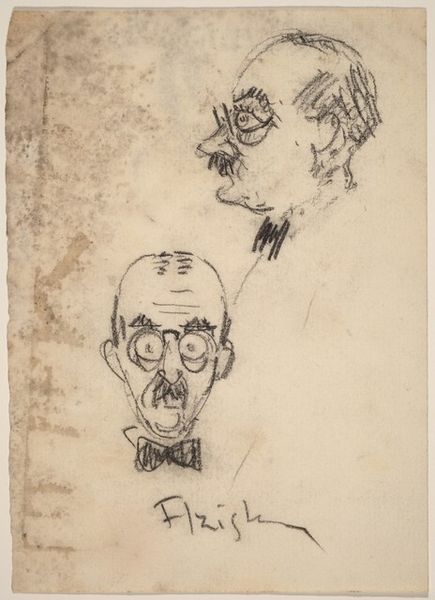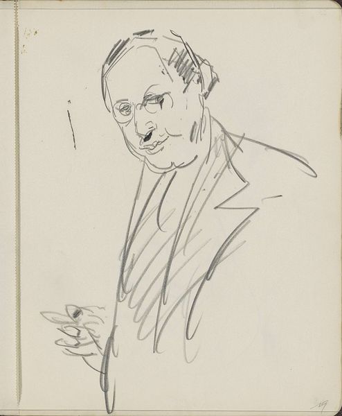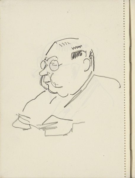 Curator: Here we have Cornelis Vreedenburgh’s “Head of a Man with Glasses,” a drawing made sometime between 1890 and 1946. Editor: My immediate reaction is that there’s a distinct melancholy to the work. The downward gaze, the simplified lines... it speaks to a quiet resignation. Curator: Interesting. For me, what stands out is the artist's deliberate choice of pencil and paper. It points to accessibility, to a medium readily available. Was this portrait destined for a grand salon, or was it always meant to be more immediate, more democratic? And did this subject have the social means to pay the artist to capture the essence of himself? Editor: Well, considering the timeframe, it's difficult to ignore the rising tide of anxiety permeating intellectual circles. The portrait could reflect the individual's struggle for visibility amidst societal upheaval. It speaks of a crisis in representation, almost like the person’s identity is being simplified or erased. I wonder about this individual and the weight they had to bear at such a transformative time in the world. Curator: Yes, the minimalist technique emphasizes the face. We should consider the paper quality itself – is it mass-produced or something more specialized? The means of production reflect larger artistic movements challenging traditional notions of art and craft during the 20th century, making space for the democratization of tools and subject matter, regardless of who the subject is. Editor: Absolutely. It’s fascinating how the glasses themselves function as both a literal and metaphorical lens. They signify intellectualism, but also create a barrier, perhaps speaking to the inaccessibility of knowledge, or the way perception is always mediated by structures of power. What did being nearsighted mean at this time? It brings to mind ideas of seeing, knowing, and being seen, all complicated by visual impairment. Curator: Examining the material and the circumstances allows us to reconsider these common notions through an economic and social lens. I see this now more like an exercise on capturing someone and bringing his experience in the world, perhaps unseen and burdened, to light. Editor: I concur. It's compelling how a seemingly simple sketch, with a focus on identity and social context, manages to convey the profound sense of societal burdens on this figure’s posture and downward-cast gaze.