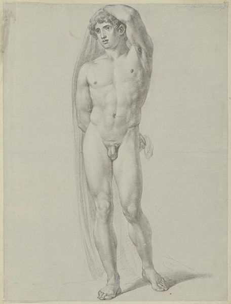 Curator: Look at this, a "Standing Male Nude, Arms Behind Back" sketched by Jan Willem Pieneman, created somewhere between 1789 and 1853. It’s currently housed in the Rijksmuseum. Editor: First impression? It feels almost… constrained. The pose, the red chalk. There's a vulnerability to the power usually associated with male nudes. Like a classical statue caught off guard, or maybe even a prisoner. Curator: You've hit on something interesting there. Pieneman, while becoming famous for his large history paintings, also explored classical poses in his studies, and it is likely that it was his study. He often used drawings like this as references. Think of it as the artist wrestling with idealised forms, filtered through, shall we say, the very real constraints of the human condition. It is the burden of history on a figure. Editor: Absolutely, and the medium accentuates that. Red chalk—sanguine—gives it this flesh-like warmth, but it also feels… raw, immediate, unfinished. As if Pieneman is deliberately leaving the idealized form unperfected, still marked by life. Curator: A little like humanity’s best efforts to reach greatness are still marked by its limitations? A history painter couldn't escape the political upheavals and societal scrutiny of the era. It shows a consciousness and the need for something beyond the mere replication of historical images. Editor: Precisely! I am captivated by the way Pieneman evokes these societal expectations while showcasing this vulnerable corporeality through this male figure. The historical, social, and individual entangle, producing an oddly emotional effect. This art encourages critical examination of history and how society looks upon men. It becomes a quiet defiance. Curator: So it is both of our burden that this one makes us ponder at length! Editor: This artwork transforms an almost simple drawing into a powerful statement about power, vulnerability, and the enduring weight of history. Curator: Absolutely, and in this very intimate drawing, it speaks softly, doesn't it?