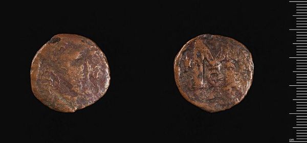 Editor: This is a Half Follis of Phocas, a coin currently held at the Harvard Art Museums. The wear and tear on the coin are immediately striking. What does its survival tell us about power and representation? Curator: Absolutely. This coin embodies the concept of durable authority. Phocas, an unpopular ruler who usurped the Byzantine throne, used coinage as propaganda. The cross on the reverse, though a symbol of religious power, also highlights the complex relationship between church and state. Editor: So, the coin is more than just currency; it's a statement? Curator: Precisely. It’s a statement of legitimacy, a visual assertion of power amidst political instability. What do you think the long-term impact was? Editor: It's fascinating how a small object can carry such heavy historical weight. I see now how it reflects the Byzantine Empire's struggle with power and religious authority. Curator: Indeed. Studying these objects can unlock deeper understandings of sociopolitical complexities.