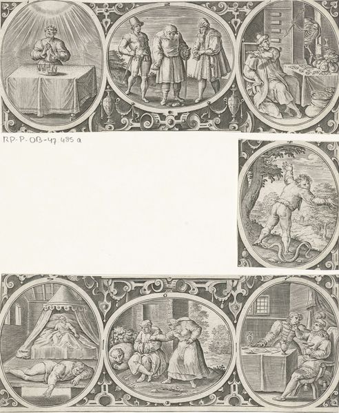 Editor: This is "Opstanding, Christus verschijnt aan zijn moeder, Christus verschijnt aan Maria Magdalena, Christus in Emmaüs" created in 1510 by Albrecht Durer, and currently housed in the Rijksmuseum. It’s a print featuring a series of scenes. What strikes me is the stark contrast and how the story unfolds in these four distinct vignettes, like a comic. How do you interpret this work, especially considering the time it was made? Curator: This print is more than just a biblical narrative; it's a commentary on power, faith, and societal roles in the Northern Renaissance. Durer's choice to depict these specific resurrection scenes—Christ appearing to his mother, Mary Magdalene, and in Emmaüs—highlights different aspects of faith and gender dynamics. How does the relatively small scale of the print affect its reception, do you think? Editor: Well, maybe the size encourages closer inspection. But how might these depictions challenge or reinforce the period's views on women, given their prominent roles in these scenes? Curator: Precisely! Consider the social expectations of women at the time. Their emotional experiences were often dismissed, yet Durer centres their encounters with the resurrected Christ. Mary Magdalene, especially, challenges traditional roles as she becomes a key witness. Also, think about the Reformation brewing during this time. What do you make of the possible subversive elements within Durer's detailed realism? Editor: I see what you mean. It's like Durer is quietly empowering these women, giving their experiences validity through art. The realism perhaps lends authority to these narratives in a way that’s surprisingly bold. It gives them agency and emphasizes their importance in the gospel. Curator: Exactly. Through this close attention to both the divine and the human, Durer provokes questions about power structures. The print becomes a visual discourse. Editor: So, beyond the religious context, we're also looking at social and political statements embedded in the art. That’s powerful, I didn't think of it that way at first! Curator: Precisely. The image becomes more than just scenes from a religious book; it reflects on issues surrounding society.