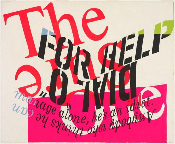 Curator: Corita Kent's "Give the gang (the clue is in the signs)" just bursts with energy, doesn't it? The Harvard Art Museums hold this vibrant print. Editor: It does. I find the composition almost chaotic, yet the colors—that bold orange, stark black, sunny yellow—somehow unify it. Curator: Kent's work often layers text and image, pulling from advertising and pop culture. She saw poetry in the everyday. Editor: Indeed, the fragmented words and phrases create a visual poem, a kind of semiotic puzzle inviting the viewer to decode its message. Curator: And the message, for me, is about paying attention, listening to your heart, and finding clues in the most unexpected places. It’s a gentle prodding, full of hope. Editor: Yes, there's an undeniable optimism, even a playful irreverence, in how she manipulates language and form. Curator: Looking at it, I feel encouraged to seek meaning beyond the surface. Editor: And I'm left pondering the relationship between text, image, and the viewer’s own interpretation in the process of meaning-making.