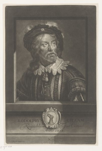 Frans Everbag created this small print, "Vrolijke drinker," using an unidentified printing technique. The sitter's immediate presence stems from Everbag's use of tone, a limited palette of earth colours, and a direct gaze. The soft textures and diffused light give the image a warm, inviting quality. The sitter seems to be emerging from a hazy atmosphere, highlighted by the contrast between the dark, wide-brimmed hat and the crisp white collar. Everbag seems to reflect on the tradition of portraiture, playing with elements of light, shadow, and form to create a modern interpretation of a classical subject. This challenges viewers to reconsider the boundaries between past and present, and to recognize how artistic conventions evolve over time. Note how the subject's somewhat open gesture—a hand raised, a glass tilted—suggests an interruption, an invitation, or perhaps a challenge to the viewer. The way the formal elements are structured asks us to consider not only what we see, but also how we interpret it.