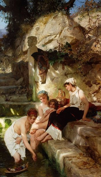 Lawrence Alma-Tadema painted "A Favourite Custom," capturing a scene of women in a Roman bath, a space of social ritual and cleansing. The laurel wreath worn by one of the bathers is a powerful symbol here. We see this emblem of honor and victory dating back to Apollo in ancient Greece and Rome. Yet, look closer, and you'll see a transformation. In Renaissance paintings, laurel wreaths often crown poets and scholars, signifying intellectual achievement, and here, the motif is used to glorify feminine beauty and leisurely indulgence. It’s a subtle shift, but revealing. This imagery evokes a psychoanalytic understanding of cultural memory, where symbols are transmitted and adapted through generations, subconsciously influencing artistic expression. It's a fascinating evolution, as the wreath adorns the head of a bather, reminding us of how symbols constantly morph, carrying echoes of past meanings into the present.