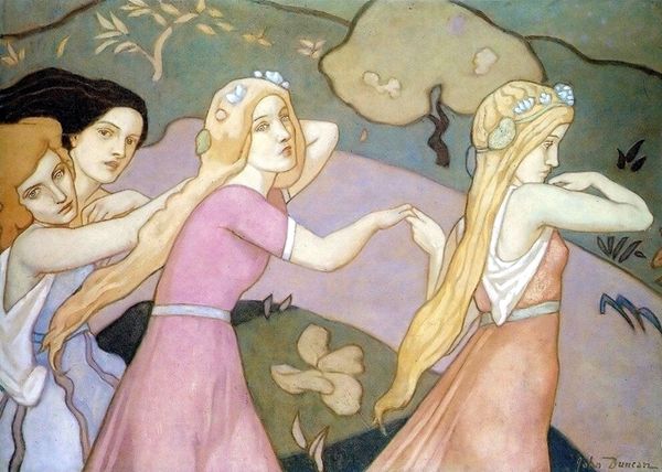 Curator: Welcome! Today, we’re considering Guity Novin's "My Women", a painting using acrylic on canvas that seems to radiate a melodic aura. Editor: Melodic indeed! It’s instantly captivating—a trio of blue figures with instruments. Almost mournful, yet vibrant, like a dream dipped in indigo. The way the medium flows feels very watery too, very loose. Curator: You've nailed it—a sense of fluidity. And this piece appears very much anchored in material realities, especially considering its engagement with acrylics. Novin carefully renders a folk aesthetic, blending a kind of naive sensibility with figuration to question perceptions of women through instrumentation and composition. Do you perceive social commentary or some type of emotional narrative there? Editor: Absolutely. It’s like a folk tapestry woven from threads of melancholy and defiance. It’s interesting how the figures are dressed – like working-class artisans dressed in what must be precious fabrics or what the artist imagines those fabrics to be. And, do you notice that the painting emphasizes labor and material wealth simultaneously, almost posing a dialectic? What’s the context surrounding its making? Curator: While undated, its thematic consistency links it strongly with Novin's Neo-Figurative period post-revolution, marking her socio-political sentiments and artistic maturation following displacement. Editor: Right! Seeing the post-revolution context gives new insight into this convergence of craft and statement through fabric and labor, through art-making materials. The women look a little lost; this reinforces that feeling of post-revolution uncertainty you speak of. Curator: A beautiful observation that reinforces its depth. Editor: Yes! Considering this analysis, there are many interesting takeaways on art and production—perhaps, an example for re-evaluating class, gender, and Iranian art in general! Thank you so much! Curator: Absolutely! It gives much food for thought regarding personal expression amidst material and societal pressures. Thank you.