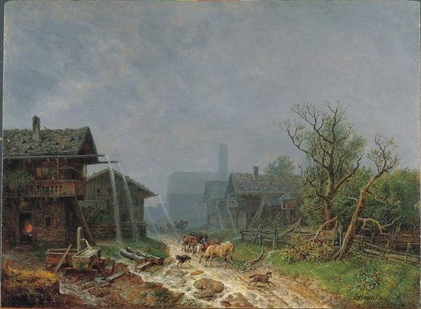 Andreas Achenbach created this view of a "Westphalian Mill" with oil on canvas. The scene is dominated by the interplay of water, architecture, and foliage, rendered with a focus on texture and light. The cool tones of the water contrast with the warm hues of the mill and surrounding trees, evoking a serene yet dynamic atmosphere. Achenbach’s composition is structured around the contrasting elements. Note how the verticality of the mill is offset by the horizontal flow of the water, creating a balanced tension. The artist uses the formal elements of color and texture to explore themes of nature, industry and the picturesque. The semiotic interplay of these elements, where the mill represents human intervention and the water symbolizes nature's force, underscores a Romantic fascination with landscape. The interplay between the organic forms of the trees and the geometric structure of the mill encourages reflection on the relationship between humanity and the environment. This painting can be seen as an exploration of these relationships, inviting us to reconsider the structures of meaning and representation.
