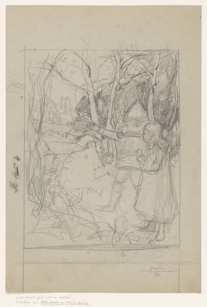 Curator: This is Camille Corot’s drawing, "The Encounter in the Woods", currently residing at the Harvard Art Museums. Editor: It possesses such an immediate sense of the transient, the fleeting moment captured in graphite. Curator: Precisely. Note how Corot uses the rapid, almost scribbled lines to suggest both form and movement. The figures, though present, seem on the verge of dissolving back into the forest itself. Editor: Beyond the formal aspects, it invokes classical imagery of woodland nymphs or perhaps biblical connotations of people wandering in search of shelter. The woods here are not simply trees, they symbolize refuge, the start of a journey perhaps? Curator: A compelling interpretation. The drawing does leave much open to speculation, doesn't it? Perhaps that is its greatest strength—a structured ambiguity. Editor: It is this interplay between technique and symbolic potential that fascinates me. Curator: Yes, a dialogue between structure and symbol.