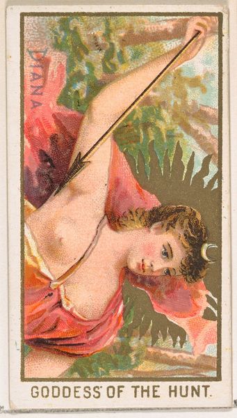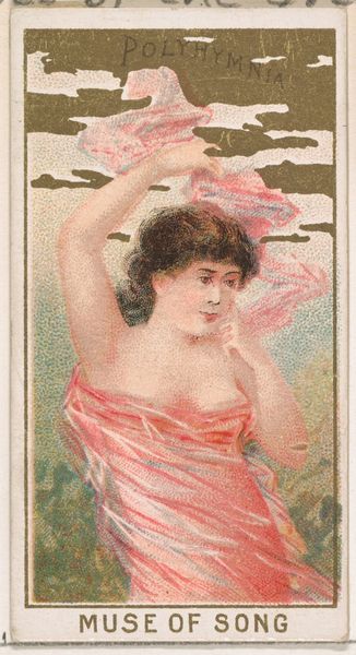 Curator: This print is titled "Nox, Goddess of the Night," part of the "Goddesses of the Greeks and Romans" series issued around 1889 by Wm. S. Kimball & Co. The medium here is a lithograph. Editor: The first thing that strikes me is the romantic softness. The color palette is restrained, almost pastel, which gives it a dreamy, ethereal quality. Curator: Absolutely. This wasn't fine art, though. Kimball was a tobacco company. These goddess images were actually trade cards included in cigarette packs, essentially promotional ephemera. They were mass-produced objects meant to be collected. Editor: Interesting. So the appeal wasn’t just the classical theme, but also the accessibility of the medium. Lithography allowed for relatively inexpensive color printing. The very visible dots speak to a democratized, mechanical image-making process. It contrasts quite sharply with the elevated subject matter. Curator: Precisely. This series tells us something about the aspirations of a rising consumer class. Owning, or rather collecting, art, or representations of it, was within reach. It speaks to the ways mythological narratives were being integrated into popular culture and daily life through commercial enterprise. Think about the skill of the draughtsman, versus the purely commercial function of their labour here. Editor: Right. But still, considering the formal choices—the languid pose, the soft lighting, the subject’s eyes closed. This isn't just selling cigarettes; it’s selling an ideal, maybe a vision of tranquility in a rapidly industrializing era. The woman and her flowing tresses merge into the landscape behind. This speaks of formal integration. The golden star shapes set the scene and reflect her sun-kissed locks. Curator: And how the object circulated mattered as much as the image itself. Were these collected? Traded? Or simply discarded? They became a visual shorthand to prestige through a carefully manufactured type of ‘high culture’, cheaply purchased and casually disposed of. Editor: It’s amazing how much this small rectangle reveals, both about the art of that period, and the economy surrounding it. Curator: Indeed. From smoke, a myth, then and now!