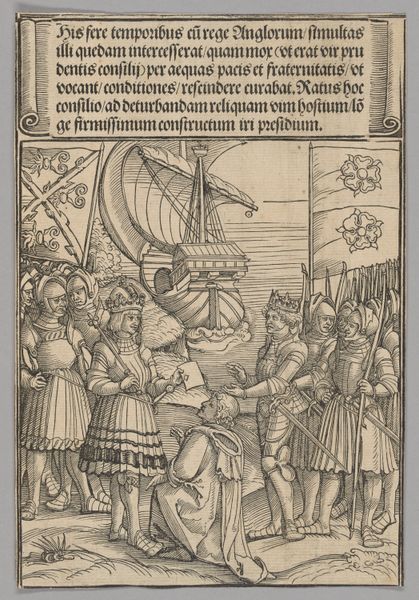 Curator: Today we’re looking at an illustration, “Wie die Troianer mit den Griechen gestrit!,” or "How the Trojans Fought with the Greeks!" Plate 24 from *Woodcuts from Books of the XVI Century,* credited to Hans Weiditz, II, dating from around 1536-1937. It's currently held at the Art Institute of Chicago. It utilizes woodcut on paper. What strikes you immediately? Editor: Chaos. The whole thing feels incredibly dense. I see a roiling mass of bodies and ships, almost indecipherable in its details. The high contrast of the woodcut emphasizes the disarray, but there's also an incredible energy in that. Curator: It is very dynamic. Consider the context. Weiditz was creating illustrations during the Northern Renaissance, a period deeply engaged with classical themes, including the Trojan War narratives. However, rather than idealizing war, the image seems to capture its brutal reality. What we see may not be as heroic as expected. Editor: Precisely! There's a decided lack of idealized form. The figures are somewhat grotesque, their expressions intense, maybe pained, with bodies almost violently contorted in the throes of battle. And those ships, looming large, and oddly fragile as geometric forms against the violent swells and sky. Curator: The density you mentioned underscores this, suggesting the scale of conflict and its impact on those involved, regardless of rank or position. The battle wasn't about the powerful heroes. Everyone got affected in a time when a heroic narrative was more widely appreciated. Editor: Absolutely. Technically, the limited tonal range typical of woodcuts simplifies the forms, forcing the viewer to interpret the scene’s nuances from texture and composition, which are themselves conflicting and overwhelming. I like how this plays into creating an emotional narrative beyond the obvious clash of bodies. Curator: I concur, it is the emotionally raw presentation, juxtaposed with a heroic story, which really holds my interest, forcing a needed questioning about the politics of that moment, about class and representation, about trauma and aftermath. It really pushes its viewers to understand the meaning behind all those stories. Editor: A unique, visceral encounter with the familiar Trojan War story. I feel I could spend a very long time untangling the formal aspects of it!