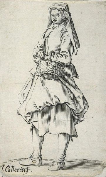 Editor: This is "En kvinde bærer en krøbling," or "A Woman Carrying a Cripple," by Wilhelm Marstrand, dating from 1810 to 1873. It's an ink and pen drawing currently held at the SMK in Copenhagen. The level of detail he achieves with just pen strokes is quite striking. How would you interpret this work through a formal lens? Curator: Certainly. Notice the economy of line; Marstrand masterfully employs hatching and cross-hatching to suggest form, volume, and even texture. The composition directs our gaze upwards, focusing on the interplay between the figures. How does the treatment of light and shadow strike you? Editor: Well, the light seems diffused, almost atmospheric, despite the starkness of the medium. The shadows define the folds in the woman's dress and highlight the child’s face, emphasizing their connection. Curator: Precisely. The very act of drawing attention to these textural elements emphasizes a tension and a precarious balancing act. And consider the lines themselves – are they purely representational or do they carry an expressive quality beyond mere description? Editor: I see what you mean. Some lines seem more gestural, almost hurried, suggesting movement and a sense of immediacy. The two sticks leaning on the woman's shoulder seem important somehow, they seem to suggest some hidden story... or burden? Curator: Indeed. Do they visually suggest weight? How might the composition be affected without these particular compositional and thematic components? The artist here manages a semiotic encoding that relies precisely upon line, shape and tone. Editor: It does make you wonder about their relationship and their circumstances. I hadn't thought about it that way. Thanks, that gives me a lot to consider. Curator: My pleasure. It is precisely in observing these structural choices that we unlock more.