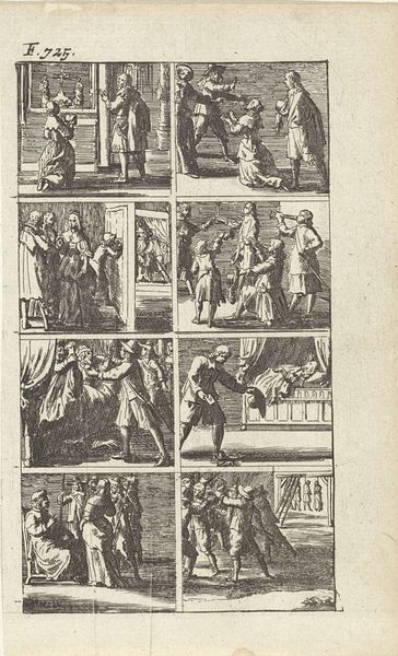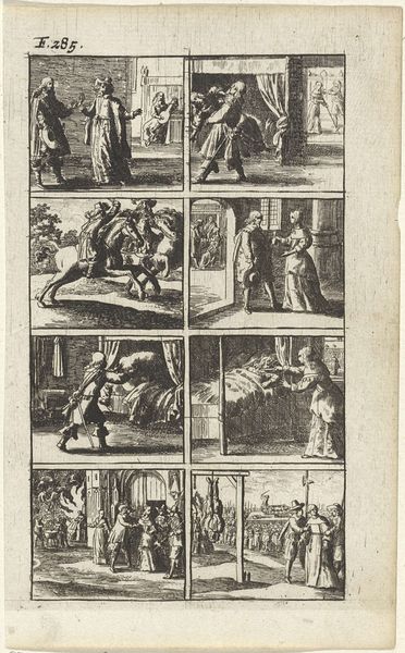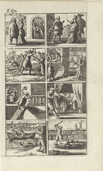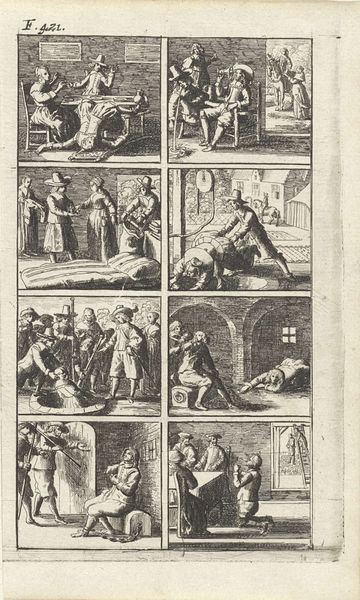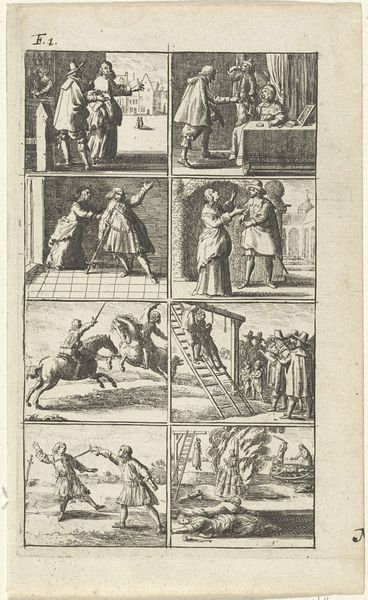 Abraham Dircksz. Santvoort created this small-scale print, "Verhaal met voorstellingen van moord en doodstraf," sometime in the 17th century. Its graphic depictions of violence and justice command attention. The print's composition is divided into a grid of scenes, each a vignette of a narrative focused on crime and punishment. The linear quality of the engraving, with its stark contrasts of light and shadow, creates a dramatic visual effect. Santvoort’s use of line not only defines forms but also conveys a sense of movement and emotional intensity. We see, for example, duels, and executions, all rendered with a detached precision that invites contemplation on the themes of morality and social order. The structure of the print—the neat compartmentalization of each scene—encourages us to read the work sequentially, constructing a story about the consequences of transgression. The scenes collectively serve as a stark reminder of the social and legal structures that govern human behavior, and the wages of defying them.