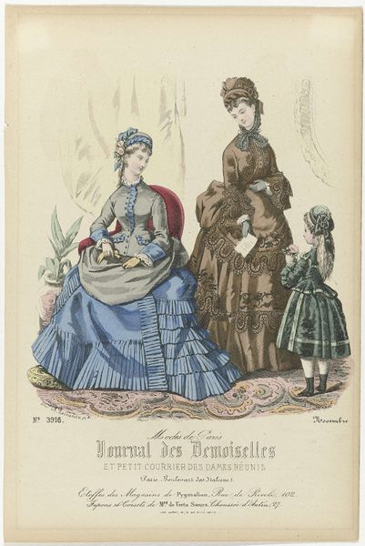 Curator: Take a look at this fashion plate titled "Journal des Demoiselles, 1 août 1895". It offers us a glimpse into the sartorial tastes of the Parisian elite towards the close of the nineteenth century. Editor: Oh, what a confection! The airy pastels, the profusion of ruffles, and those extravagant sleeves. It evokes a feeling of delicate femininity and a certain restrained opulence. Curator: Indeed. “Journal des Demoiselles” was a magazine that reflected and helped shape bourgeois norms through its illustrations. These images provided templates for dressmakers and consumers alike. The construction and adornment of each garment carried explicit and implicit values concerning gender, class, and nation. Editor: Focusing on pure form, notice the emphasis on the vertical line—elongated by the slim skirts and accentuated by parasols. The light palette unifies the composition, yet within that harmony, there’s also a play of textures—the smooth expanses of fabric offset against the lace detailing. Semiotically, the clothing could represent ideas of status and refinement. Curator: Right, and we must remember the social context. These magazines weren't just about aesthetics, but a way to teach women how to express themselves appropriately within strict social guidelines. It’s a visualization of prescribed gender roles and an elaborate marketplace of status and aspiration. Editor: Perhaps. Yet, to analyze its shapes, forms, and relations is still a gateway to an appreciation of its power. Ultimately, the image offers an aesthetic pleasure transcending those constructs. Curator: And how its context allows us to view the power structures from a different angle! By understanding the conditions that shaped these representations, we learn not only about past aesthetics, but also about present-day ideologies. Editor: Agreed, context is necessary for deeper consideration; but on the surface, the image pleases because its elements speak eloquently to the eye. The artist clearly made confident and inspired decisions about its execution. Curator: Precisely. This offers not just an illustration but also insight into a world preoccupied with displaying one's social standing through fashion, illustrating the social politics in the era of la Belle Époque. Editor: Very well, it is indeed both lovely and laden!