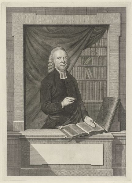 Curator: This is Reinier Vinkeles' "Portret van Johan Diedrich Deiman" from 1782. It's currently held in the Rijksmuseum collection. Editor: It has such a quiet, almost reserved feeling, wouldn't you say? The subdued palette, the way the figure is positioned slightly off-center… everything contributes to this sense of contained composure. Curator: Vinkeles operated in a vibrant Amsterdam, serving a patrician class keen to emulate enlightenment values. The very act of creating a portrait, especially of a scholar or someone of intellectual standing, elevated them. Editor: Note the tight linework defining the face and wig – the rigorous draftsmanship that renders textures so meticulously. His engagement with form reflects neoclassical precision. Curator: Indeed, portraits like this helped consolidate social standing within the Dutch Republic's evolving civic landscape. Deiman himself was an eminent doctor and professor. Representing these professionals broadcasted a culture that valued erudition and learning. Editor: The overall structure also reveals balance in asymmetry. While the figure dominates one side, there's a strong diagonal movement established with the lines of the curtain which balances that. Didactic portraits of scientists at their research? Curator: They subtly promoted particular ideals during a period characterized by growing faith in science and medicine as foundations of civic improvement and public health. Depicting physicians visually reinforced their authority. Editor: So, this wasn't merely a visual record; it played a definite role in cultivating values of intellectual prowess in wider Dutch society. This visual emphasis promoted values. I am persuaded to reflect about it from a fresh viewpoint now. Curator: Precisely. Vinkeles’ skillful execution contributed directly to legitimizing an increasingly influential sector during shifting social configurations. Editor: Examining the composition reminds me that images inherently shape culture and reflect those times. The experience is enriching.