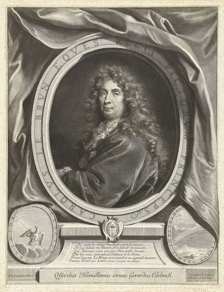 Jan Edelinck created this portrait of Jan Andrzej Morsztyn using engraving techniques during the late 17th century. Immediately, one notes the intricate detail achieved through the stark contrast of black lines against the white background, defining Morsztyn’s features and elaborate attire. The composition is structured around an oval frame of laurel leaves, a classical motif, which encloses the portrait. This form both contains and emphasizes the sitter, while below, an ornate cartouche displays his titles, flanked by symbolic keys. Edelinck’s mastery is evident in the textures rendered – from the sheen of the armor to the soft, voluminous curls of Morsztyn's hair, each meticulously delineated. The sharp lines and controlled gradations of tone reveal a concern for clarity and precision. But within this formality, there's also an implied commentary on power and status, encoded in the visual language of heraldry and aristocratic portraiture. This piece, therefore, functions not only as a likeness but as a carefully constructed representation of social identity.