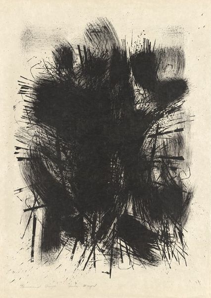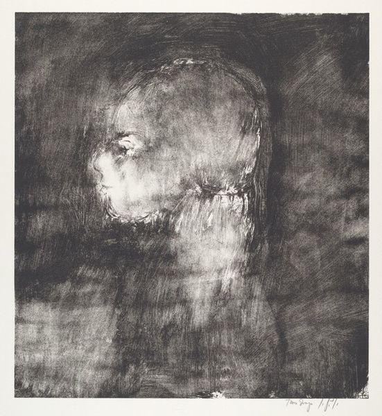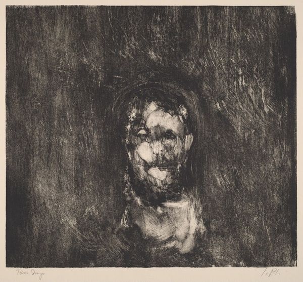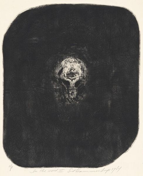 Editor: This is John Paul Jones' "Untitled," created in 1962. It's an intaglio print, a monochrome portrait that seems to emerge from darkness. I find it quite haunting. What do you make of it? Curator: Well, focusing on the printmaking process itself, intaglio involves cutting into a metal plate, applying ink, and then using immense pressure to transfer the image to paper. The intense blacks and subtle grays you see speak to the labor involved, the physical act of carving and pressing. Considering this was 1962, what do you think the artist might be conveying through the choice of this demanding, almost brutal technique? Editor: I hadn't considered the physical effort. Maybe the harshness reflects something about the subject, or even the mood of the time? There's an unsettling feeling it gives off. Curator: Exactly. Think about the materials: the metal, the acid used to etch, the ink, the paper. Each contributes to the final product, yet their origins and the industrial processes behind them are largely obscured. It challenges traditional ideas of artistic creation, blurring the lines between craft and fine art, doesn't it? Does it raise any further questions for you about the artwork? Editor: It does. Knowing that the print is part of a potentially unlimited series affects how I perceive the "originality" and uniqueness of the artwork itself. Is each print simply a reproduction or something more? Curator: Precisely! Each print becomes a document of the labor, pressure, and materials involved, each holding unique marks. This shifts the focus from the singular artwork to the broader system of production and consumption, influencing meaning and worth. Editor: I see. I was so focused on the face in the image that I overlooked the significance of the printing method. Thanks, I appreciate learning about a new point of view. Curator: And I you, reflecting on art's labor invites to acknowledge a much larger network than traditionally understood.