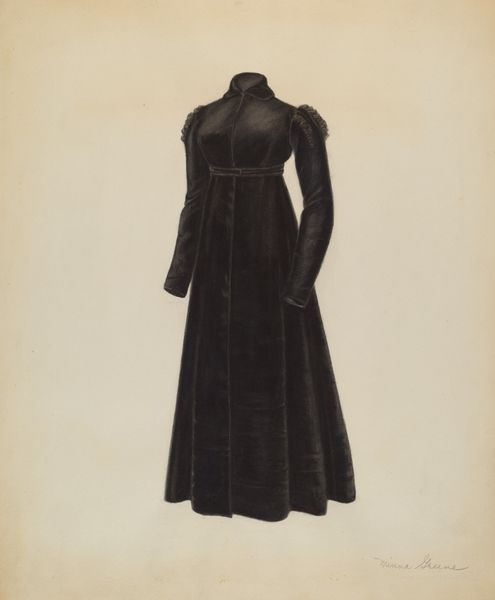 Curator: We’re looking at "Dress," a graphite drawing dating to around 1938 by Bessie Forman. Editor: It strikes me as melancholy, a silent portrait of something absent. The dress is so carefully rendered, yet devoid of a body. The puffed sleeves seem to sag slightly. Curator: Notice the artist’s attention to form; the tonal gradations that describe the fabric’s weight and sheen. The structural integrity is achieved through carefully modulated shading, and precise linework to define the dress. The texture invites haptic inspection, almost persuading one to reach out and touch the piece. Editor: I can see that, but to me it speaks of the gendered expectations imposed on women of the period—corseted into shapes, literally and figuratively. Consider how this image represents women and femininity under patriarchy in the pre-war years. This idealized, empty dress, perfectly tailored but going nowhere, becomes a stand-in for expectations and dreams denied by social constraint. Curator: Certainly. Yet consider also the abstract properties of this object: its line, its massing, and its delicate modulation of tone. How can we divorce these inherent qualities of the artwork from the politics to derive pleasure from its artfulness, its design qualities? Editor: Art never exists in a vacuum, and perhaps our different views don’t need to be separated so much as interwoven. The close study of artistic style allows us to talk about the social implications within artistic culture. Curator: A stimulating approach to what appears at first a simple depiction. Editor: I agree, there's a powerful dialogue between materiality and societal contexts at play.