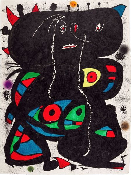 Editor: Here we have Joan Miró’s "42 Rue Blomet," a mixed-media print from 1977. The use of black is striking, almost like a looming silhouette filled with these colourful, almost playful shapes. What do you see in this piece? Curator: I see echoes, visual reverberations. Rue Blomet, where Miró had a studio, became a vibrant meeting point for Surrealists. Consider the large black form: doesn’t it resemble a collective unconscious, a vessel brimming with shared symbols and experiences? Editor: So, the shapes inside...they’re not just decorative? Curator: Precisely. Look at the repeated use of red, blue, and green—these primary colours carry primal associations, hinting at creation, emotion, and growth. Note, too, how line dictates the movement of the symbols. Miró’s vocabulary comes from memory, history, myth, and continuity. These shapes have carried meanings through various visual languages for centuries. Editor: That’s fascinating. I was so focused on the overall abstract form I didn’t consider that each individual element could also be a symbol with its own history. Is the “cartoon style” tag correct then? It isn't superficial? Curator: Indeed! That style is less a simplification than it is an encapsulation; think of how cartoons can convey complex emotions and narratives through simple forms. What psychological impact does the composition and colour usage have on you? Editor: Now that I look at it again, the black shape is both ominous and protective. All those colours trapped, cradled even. It’s like a visual diary of that time, capturing both the dark and the light of Surrealism. Curator: Exactly. The title’s a key, the imagery's a translation. Miró gives us a visual memory to examine. We carry those echoes as viewers as we decipher this.