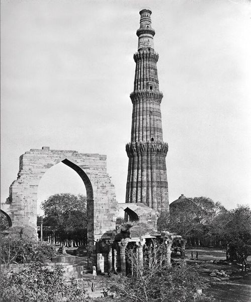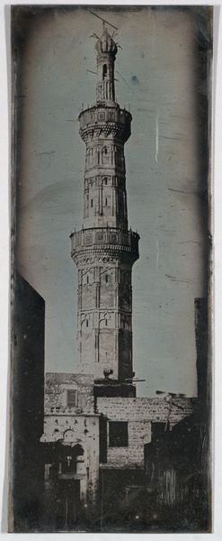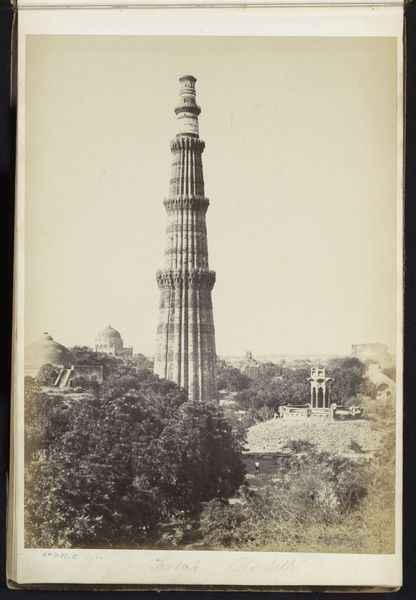 Editor: So, here we have Samuel Bourne’s photograph, “The First Gallery of the Qutb Minar in Delhi, India,” taken between 1863 and 1866. Looking at the architecture, I’m struck by how the ornamentation and detail become more intense as the tower rises. It feels very purposeful. How do you read this photograph, especially considering its historical context? Curator: It's important to consider Bourne’s role as a commercial photographer working in British India. Images like these were consumed in Britain, shaping perceptions of the ‘exotic’ East. The Qutb Minar itself, a symbol of Islamic rule, is being presented through a colonial lens. Does Bourne’s approach feel neutral to you, or does his perspective as a British photographer influence how the Minar is presented? Editor: I see what you mean. There's a stillness, an almost detached observation. I guess I had assumed his intentions were purely documentary. It’s interesting to think about how the British public might have understood this image at the time, viewing the Qutb Minar as evidence of a grand, yet conquered, past. Curator: Exactly. And think about who commissioned and consumed these photographs. They weren't meant for local consumption in India; they were tools in constructing a narrative of British power and influence. The aesthetics might seem objective, but the choice of subject, framing, and distribution all played a part in shaping a political landscape. Editor: This makes me realize how photographs are never really neutral documents, and the power dynamics inherent in colonial relationships significantly influenced artistic production, even in something that appears to be straightforward architectural photography. I will consider context more carefully moving forward. Curator: Precisely! Understanding the market and the mechanisms through which images circulate is vital to analyzing any work of art, especially those made within or about a colonial context. It provides us with the chance to analyze and comprehend art, not only from the artist's viewpoint, but through the public’s understanding of it.