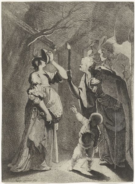 Curator: What immediately strikes me about this image is its almost stark simplicity, the overwhelming impression of light on fabric against a shadowed, textured background. It's rather luminous, isn't it? Editor: Absolutely. We’re looking at "St. Bruno," a Baroque engraving by Claude Mellan, likely completed sometime between 1600 and 1688. Currently it resides here at the Metropolitan Museum of Art. The process here is central, really. Look how Mellan used engraving to mimic light itself. Curator: Light made tangible! He certainly achieved that ethereal quality. It's fascinating how the details, or lack thereof, really emphasize the monk’s inner contemplation, his spiritual communion. Even his humble garments seem illuminated by grace. It almost makes you feel like an intruder. Editor: Exactly! But think of the labor. Each line, deeply considered and carefully etched, serves a function, creating form, value, texture. The tools themselves dictate a visual language, which serves the purpose of depicting St. Bruno in communion, yes, but within this landscape! Curator: And a somewhat bleak landscape at that! See how that dog’s expression is practically lugubrious? Almost comical, yet rather endearing. What about the almost casually-depicted skull there in the shadow? Does the bleakness there somehow heighten the Saint's inner peace and contemplation? Editor: Precisely! The imagery has both sacred and profane, creating tension to engage in religious, even social and political discussions. Who had the resources, what type of labour did he command and under which social forces or patrons created an art that depicts St Bruno. Curator: In any case, I do appreciate how such an unadorned style leaves space for personal interpretation. It feels remarkably immediate for a piece made so long ago; not many artists were thinking about the interiority of everyday humans back then. Editor: Yes, considering Mellan's skills and artistic intent helps us fully grasp the choices that shaped this print. To examine how the final materials, process, and image served social practices that created meaning in a time very unlike ours.