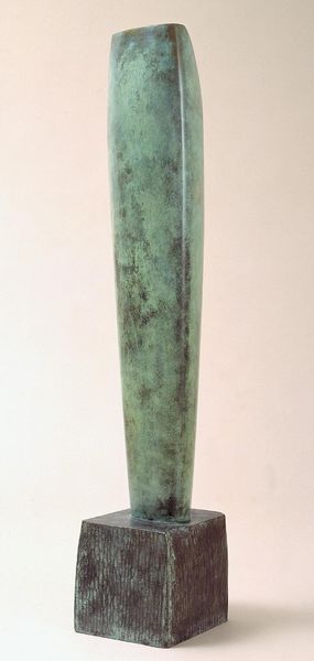Curator: William Turnbull's sculpture, "Queen," presents a compelling study in form. The patinated bronze creates a striking verticality. Editor: My first thought is that it reminds me of an ancient obelisk, something from a lost civilization, promising mystery. Curator: Note the interplay between the smooth, curved apex and the rectilinear base. The geometric incisions add another layer. Editor: Those incisions could represent social strata, perhaps? Or even a royal lineage etched into the queen's very being. Curator: An interesting interpretation. I’m more drawn to the tension between the sculpture's mass and its subtle surface modulation. Editor: It's potent, a powerful symbol of female authority, even without explicit representational features. A timeless icon, really. Curator: The artist makes expert use of line and shape. It is a refined composition. Editor: Seeing it this way definitely enhances my appreciation. It’s more than just an object. Curator: Indeed.