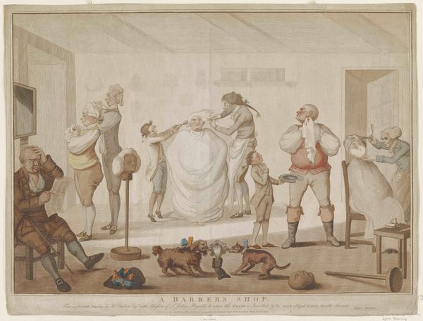 Curator: Standing here, we're looking at a watercolor illustration, “Doctor Syntax en vijf andere figuren op een begraafplaats”, or "Doctor Syntax and Five Other Figures in a Cemetery", by Thomas Rowlandson, around 1820. It's a curious dance of the macabre, wouldn't you say? Editor: My first impression is definitely grim—though a strangely… jovial grim. The way Rowlandson has rendered the scene in this light wash is odd, as I immediately wonder if that groundkeeper knows the value of the artifacts in his hands? Curator: That’s Rowlandson for you; finding humor in odd places! The light, as you noticed, tempers what would otherwise be quite a morbid scene. Observe how Rowlandson plays with the graveyard setting—its stones, gates and figures acting less as symbols of death and more like players on a crowded stage. Editor: True, but let’s consider the materiality for a moment. Watercolors—they weren’t exactly considered the medium for serious art back then, were they? Rowlandson making social commentary using this accessible medium, speaks volumes, no pun intended. I imagine many such works of this type went unsigned at the time, however, Rowlandson found a way to commodify his satirical images in albums. It appears he valued and even made lucrative that labor. Curator: Exactly! And to that end, what do you make of our protagonist? "Doctor Syntax" as the title suggests…is seemingly impeding the way of others from moving across the gravesite with the somewhat eager sexton who seemingly has the earth ripped apart to hand off a fresh dug-up skull! Editor: I mean the scene’s theatrical nature does suggest something’s at play beneath the surface here. It's also telling that a clergyman seems so… disconnected from his flock’s reality? Are we laughing at class division, perhaps? And this almost stage-like composition… feels like an indictment of performative mourning. This commodified sadness, eh? It would seem that Mr. Rowlandson wanted us all to think about this in some way shape or form and question it at its very core. Curator: So in the end we must ask what Rowlandson has really done—has he poked fun at mortality, or just those of us on display for our limited time of existence? Editor: Seems, as is often the case, it may be both. This artwork seems like a wonderful time-capsule example for any and all of us.