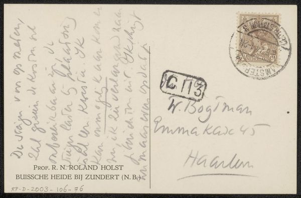 This is the back of a postcard, probably sent some time in the 1930s, by Richard Nicolaüs Roland Holst. You can see the two green postage stamps up at the top right, and the writing is this sort of elegant dark ink. It's so interesting looking at someone else’s handwriting, isn't it? It's like getting a glimpse into their mind, their process of thinking. Notice how the loops of the letters connect and flow, almost like a dance. Look at the capital letters - there’s a real flair there, a sense of someone enjoying the act of writing. It reminds me of how I approach painting, where each brushstroke is a response to the previous one, a conversation between the hand and the eye. I can really feel the energy and personality of Roland Holst in this simple everyday communication. Art is so often a private moment of connection. Do you think the recipient knew they were in conversation with an artist?