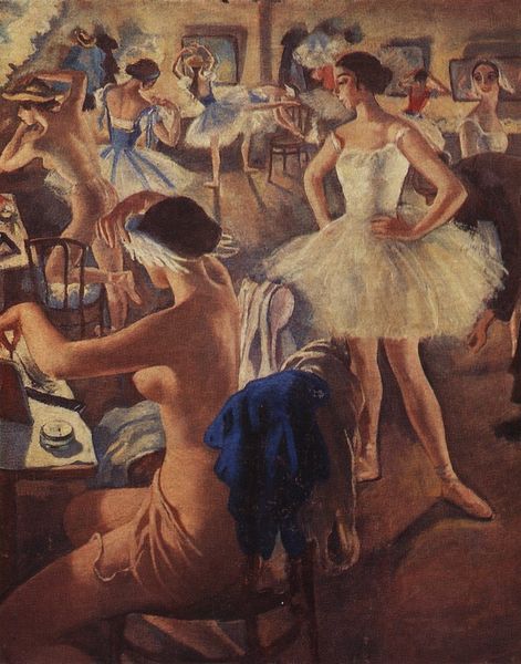 Zinaida Serebriakova created this piece of ballet dancers in their dressing room with pastels, and you can really feel that powdery texture. Look at how the marks aren't blended perfectly, letting the process show. I love how the surface feels almost like a memory, hazy and soft, as if the artist quickly captured a fleeting moment. Notice the dancer in the foreground, bent over, lacing up her shoe. Serebriakova doesn't give us a sharp outline; instead, she uses these broken strokes of brown and black to define her form. It's like she’s more interested in the feeling of movement and light than in perfect representation. The smudgy quality of the pastel adds to the intimacy, drawing you into this private world backstage. She reminds me of Degas, who was similarly fascinated with dancers and their world. It’s like they're both eavesdropping, catching glimpses of these figures in their most unguarded moments. It feels like a quiet conversation between artists across time.