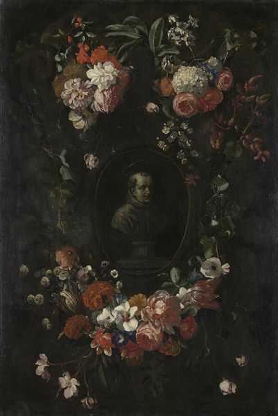 Editor: So, here we have Karel Batist’s "Wreath of Flowers encircling a Niche," painted sometime between 1659 and 1663, in oil. It's this explosion of flora, but all surrounding what looks like...nothingness. It gives me a bit of an unsettling feeling, honestly. What’s your read on this piece? Curator: Unsettling is a great word. It's almost aggressively decorative, isn’t it? All those blooms, teetering on the edge of too much, like a party guest who’s had one too many champagne cocktails. But it’s that dark niche at the heart of it all... What do you think *that* symbolizes? A void? A secret? Perhaps simply the emptiness at the heart of vanitas? Editor: Vanitas… so the transience of beauty, maybe? All these flowers, so vibrant now, will inevitably wither. But what about the niche? Why frame the void so ornately? Curator: Exactly. This isn't just about fleeting beauty, it's the dramatic contrast. Think of it like this: life and death, captured in a single frame. The Baroque period loved this kind of theatrical flourish! Do you notice how the butterflies land atop the floral arrangement like afterthoughts? As if Batist himself understood their delicate position with regard to nature’s grand spectacle. Editor: So it's this dance between life's extravagance and the certainty of its end. It’s quite a sobering thought. Curator: Absolutely. But also, weirdly comforting? I always find it a bit… liberating to be reminded that nothing lasts forever. Doesn't mean we can't enjoy the blooms while they're here, does it? Editor: I suppose not! I definitely see this piece differently now, from a slightly unsettling decorative piece, to this Baroque meditation. Curator: And that, my dear student, is the joy of art. It changes as we change.