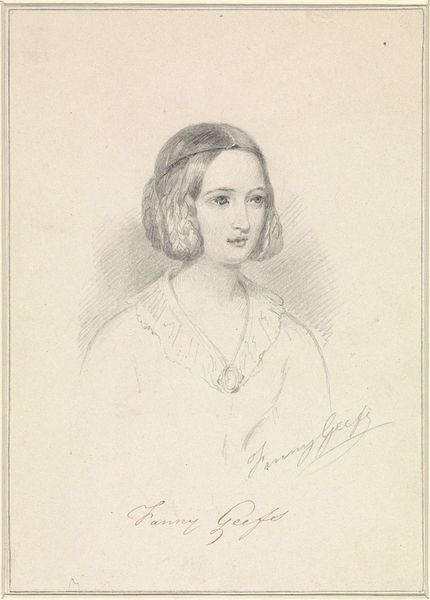 Curator: This is a portrait of Grand Duchess Olga Nikolaevna, who later became Queen Consort of Württemberg, created by Franz Xaver Winterhalter in 1856. It's rendered in pencil on paper. Editor: There's an incredible softness to it, a kind of gentle melancholy in her eyes. The delicate shading really brings out a vulnerability. Curator: The oval composition focuses our attention directly on the sitter. Winterhalter's technique uses soft gradations of light and shadow. Note how the almost ethereal quality of the drawing contributes to its Romantic aesthetic, really emphasizing feeling and sensibility. Editor: That may be, but let's also consider Olga's position. As a grand duchess, and later queen, she represents a nexus of power and privilege. Even in a drawing this subtle, her social standing is meticulously rendered through her idealized beauty. Curator: I see it as a study in idealized beauty as it operates formally within the composition. The flowing lines of her shawl, the curve of her neck—these visual elements coalesce to present a specific vision of feminine grace. Editor: True, but who benefits from such portrayals? The creation and dissemination of these images helped solidify the power of the aristocracy and normalize these specific beauty standards. These drawings are not politically neutral. Curator: Of course. Though by directing the gaze towards formal elements of line, shape, and value, a kind of aesthetic purity emerges. In itself the study of form can communicate powerfully without necessary ideological context. Editor: Still, let’s remember Winterhalter was employed to depict royalty at their best. We risk divorcing art from the society that enables its very existence if we separate its formal elements entirely from its subject. What does it mean to represent Olga like this in the context of her own historical era? Curator: Fair enough, there's much more than meets the eye on a superficial level in terms of representation and identity, despite its minimalist aesthetic. Editor: Absolutely, even simple portraits can open a wealth of interpretation through form and content.