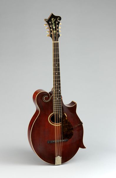 This archtop guitar was made by the Gibson Mandolin-Guitar Manufacturing Company. The colors here are a kind of gradient, going from the light shades at the center of the body, out to the darker edges – like a sunset in wood form. Think about the layers and the craftsmanship here. The guitar body is so smooth and shaped so carefully, it's like a sculpture as much as an instrument. The wood grain is visible, but it is covered by a shiny, polished surface. The way the light bounces off the body of the guitar gives it an almost liquid, ethereal quality. The texture and warmth of the wood, combined with its elegant shape is what sets this apart. This piece resonates with the work of luthiers across time who are constantly innovating, like Leo Fender, who wanted to mass produce guitars on a previously unimaginable scale. There’s so much to see here – it’s a reminder that art is an ongoing conversation.